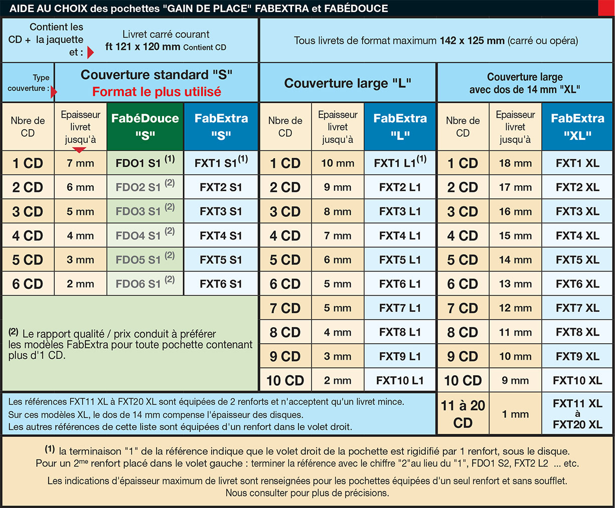 Le tableau ci-dessous vous aide à choisir les pochettes et étuis CD les mieux adaptés à vos besoins selon :
