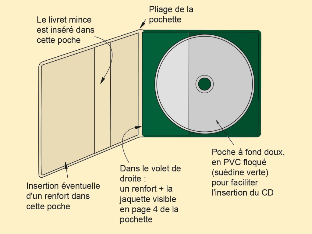 Le CD est inséré dans la poche en suédine du volet droit et un renfort lui assure une bonne planéité.