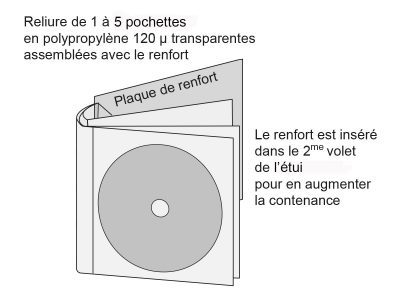 Il est possible d’ajouter une reliure de pochettes transparentes reliées à la manière des pages d’un livre pour permettre à la Fabédouce de contenir jusqu’à 6 CD.